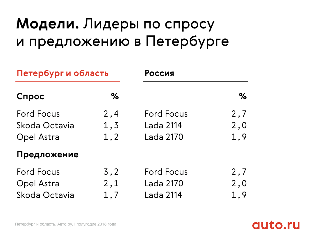 В предложениях ситуация схожая: первые две позиции занимают Lada и Toyota. На третьем месте — Volkswagen. Такая ситуация сохраняется на протяжении уже трёх лет. В целом за год предпочтения мало изменились, но в 2018 году можно отметить снижение интереса к Ford. В 2016 году марка находилась на 5 месте с долей 5,4%, а в 2018-м уже вышла из топ-5, показав падение спроса на 0,7%. При этом продолжается рост интереса к корейской Kia. В 2016 году марка занимала 8 место, в первом полугодии текущего — вошла в топ-5. Соответственно, предложения с Kia также появляются всё чаще: два года назад корейский автопроизводитель не входил в топ-10, в 2018 — уже занимает 8 место.