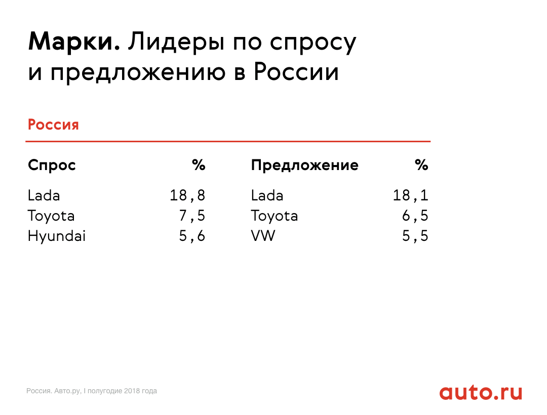 В лидерах марок по спросу (то есть по количеству просмотров телефона продавца в объявлении на Авто.ру) — Lada, Toyota и Hyundai. Впервые за последние три года южнокорейская компания обогнала Volkswagen: раньше немецкий автопроизводитель был в топ-3 интереса россиян. Разница между первым и вторым местом довольно существенная: на отечественного производителя приходится 18,8% спроса, на японского — 6,5%.