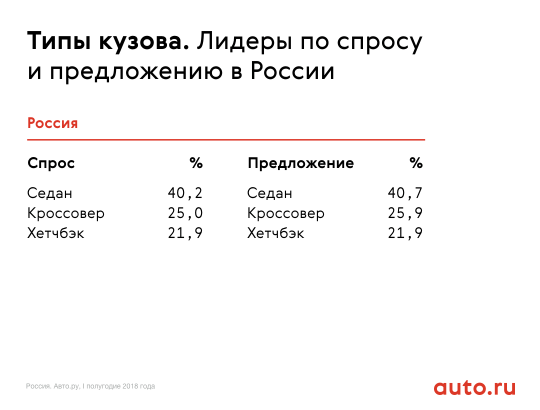 Самый распространённый в России тип кузова — седан. В объёме предложения таких машин 40,7%, а уровень спроса на них составляет 40,2%. Затем идут кроссоверы и хэтчбеки, на которые приходится 25,9% и 21,9% предложения, 25% и 21,9% спроса соответственно.