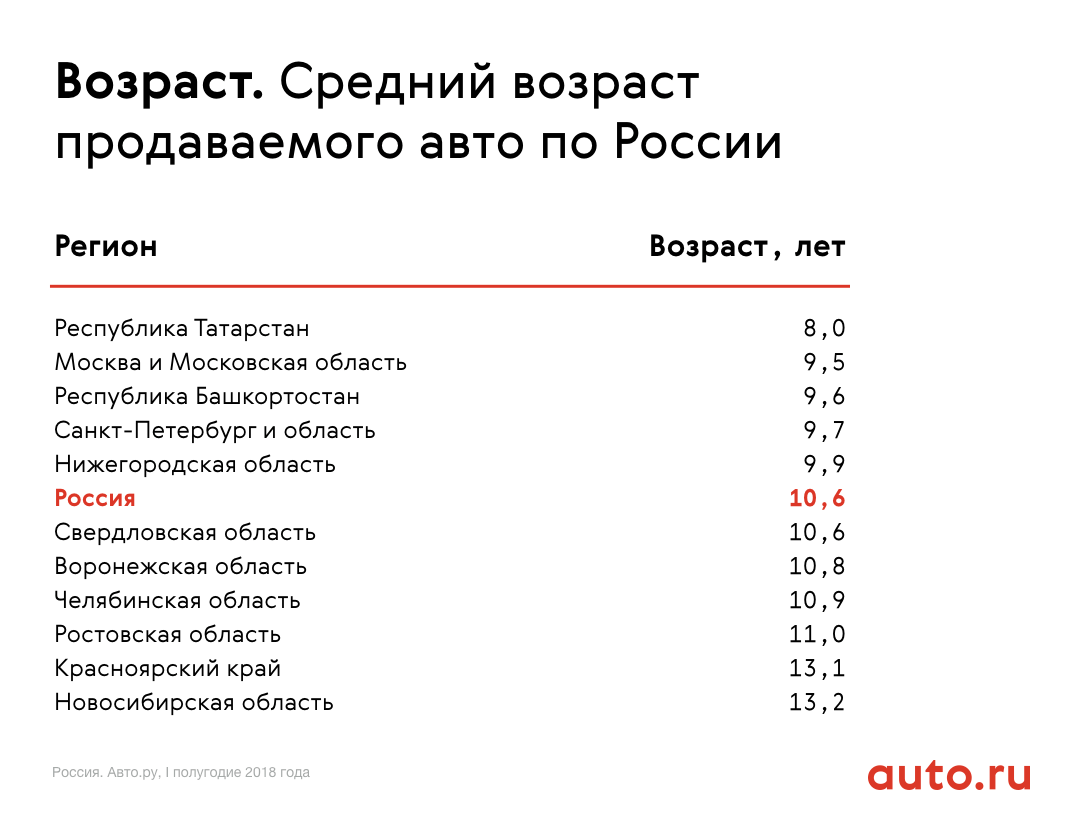 Средний возраст продаваемого автомобиля — 10,6 лет. За последние три года этот показатель вырос на один год. Так, в 2017 году средний возраст машин, выставленных на продажу, составлял ровно 10 лет. Один из самых старых автопарков находятся в Новосибирске и Омске — средний возраст машины вырос до 13,2 лет. Ещё год назад самый возрастной парк был в Красноярске (13,1 года). Для сравнения: в Республике Татарстан, где самый молодой автопарк, средний возраст машин — 8 лет. При этом средняя стоимость авто в Новосибирске ближе всего в Татарстане.