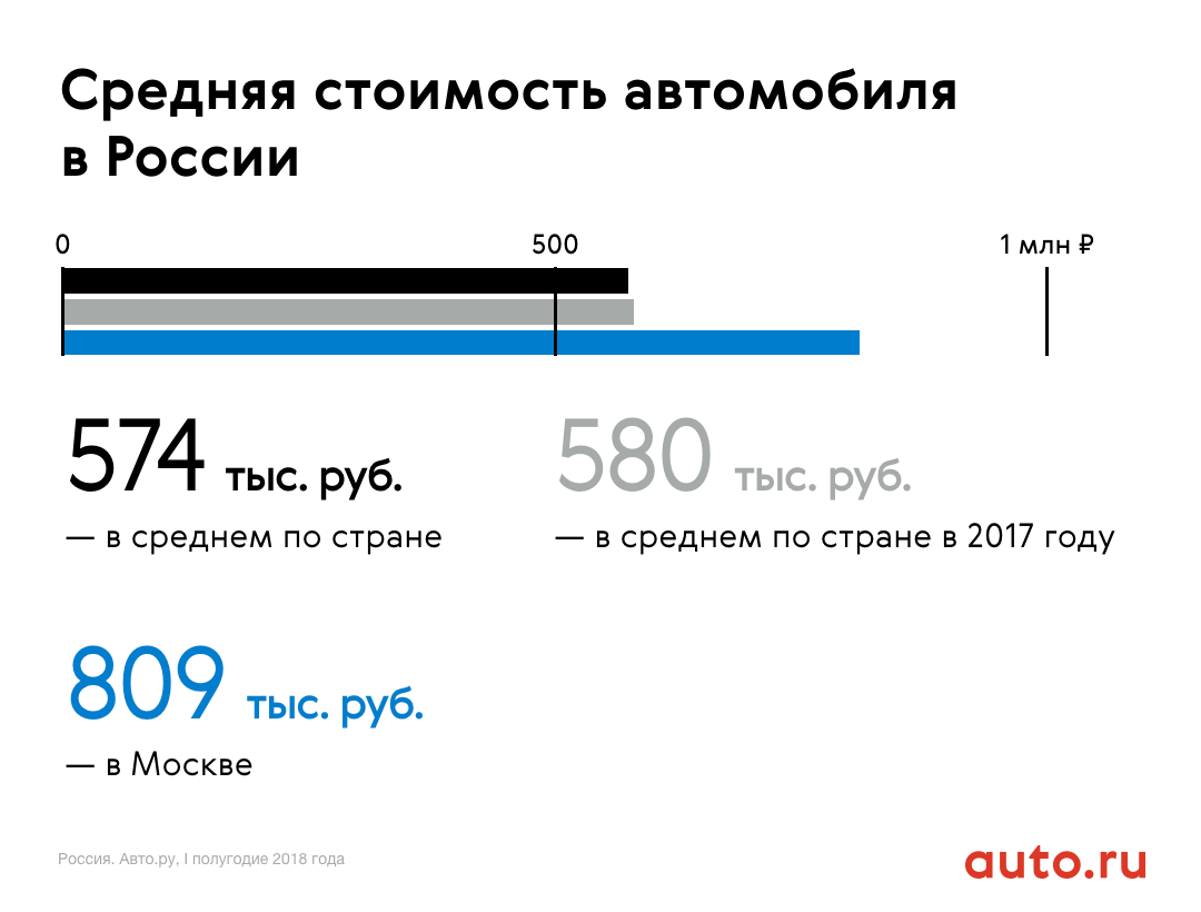 Средняя цена продаваемой машины в России составила 574 тыс. рублей, что на 3% меньше, чем в 2017 году. Самая низкая цена — в Омске, по итогам первого полугодия она составила 425 тысяч рублей. В Москве и области зафиксирована самая высокая средняя цена по России — 809 тыс. рублей, что на треть больше текущей средней цены по стран.